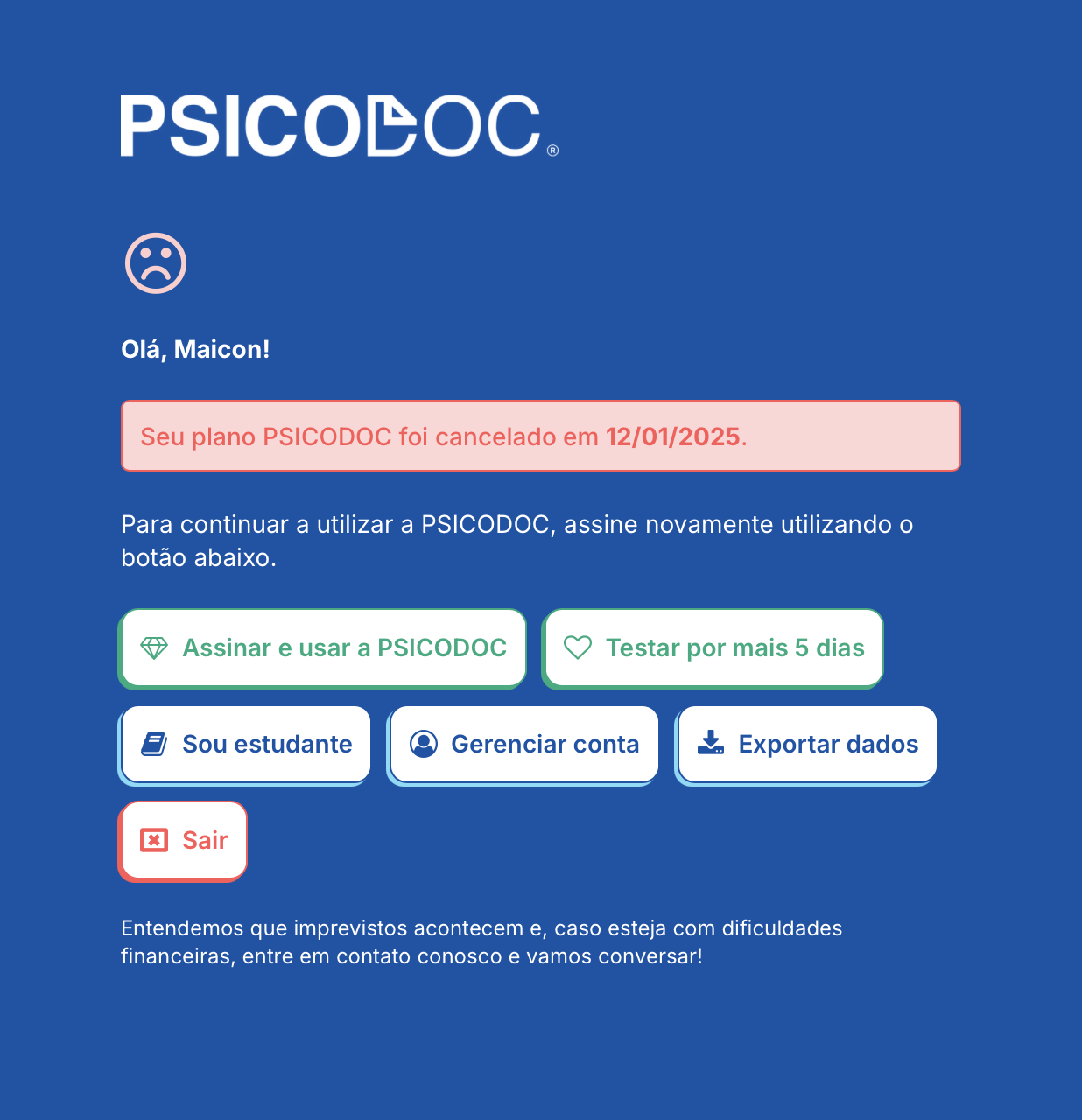 {% hint style="info" %} <mark style="color:$primary;">Caso você esteja com dificuldades financeiras e deseja continuar a utilizar o aplicativo da PSICODOC, entre em contato com o suporte para conversarmos sobre o que podemos fazer por você. 💙</mark>