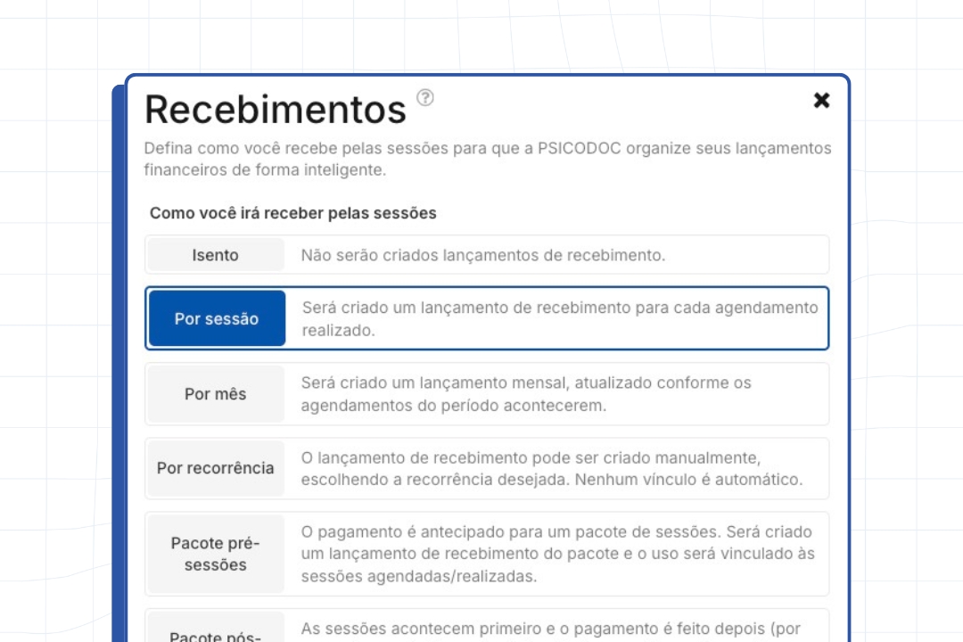 {% hint style="info" %} <mark style="color:$primary;">Nenhum lançamento será criado no momento de definição do método de recebimento. Eles serão gerados automaticamente conforme o status dos agendamentos for atualizado ou a sessão for registrada.</mark>